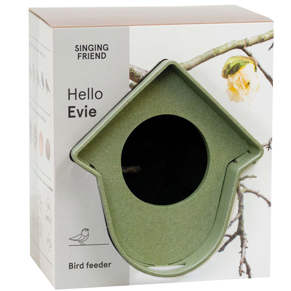 Evie is speciaal gemaakt voor vogelpindakaaspotten en vetstaven, maar ook geschikt voor suetbollen, pinda’s of stukken fruit en dit is heel makkelijk te vullen door het afneembare front. Waar je haar ook van voorziet, je plaatst het er eenvoudig in door het gemakkelijk uitneembare frontje. Evie kan met het bijgeleverde klittenband of schroef gemakkelijk opgehanhgen worden aan een regenpijp, boom, schutting of muur. Gemaakt van 100% gerecycled kunststof.