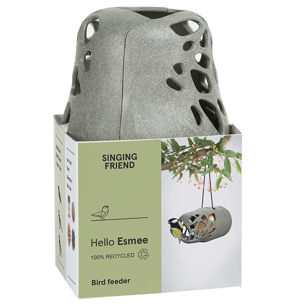 Houder speciaal voor pindakaaspot of vetbollen. Makkelijk en snel te vullen en op te hangen. Door het ontwerp kunnen vooral de kleine vogels genieten van het voer. Esmee is gemaakt van 100% gerecycled kunststof