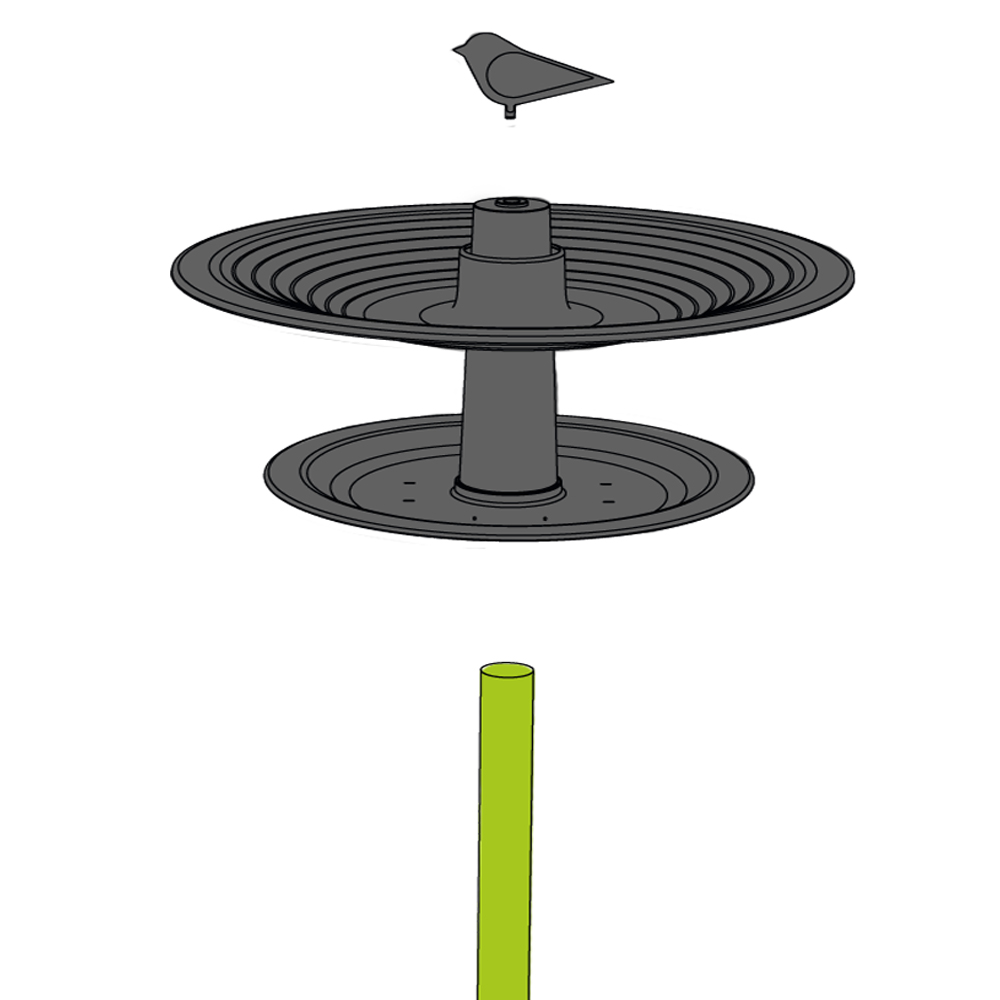 Modern kunststof vogelbad die zowel, hangend, staand op een stok of vast aan een balkonrailing kan. Het badje is demontabel en daardoor makkelijk schoon te maken.