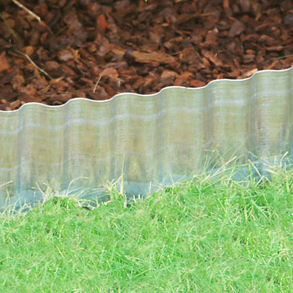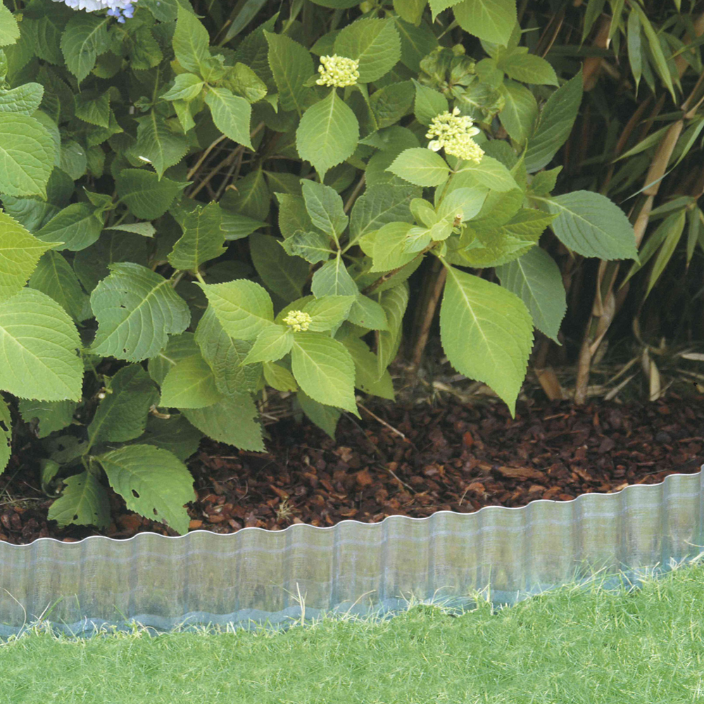 Kantopsluiting van golvend metaal voor een sierlijke afscheiding tussen gras en border.