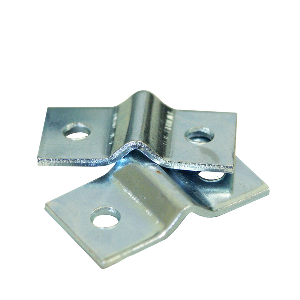 Verzinkt metalen beugeltje om gaaspanelen aan palen te bevestigen als onderdeel van een tuinafscheiding.