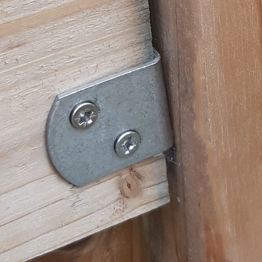 RVS hoeken met schroef. De schroef gaat in de tuinpaal en tegen de hoek wordt een houten tuinscherm bevestigd. 50 blisters van 4 stuks in doos.