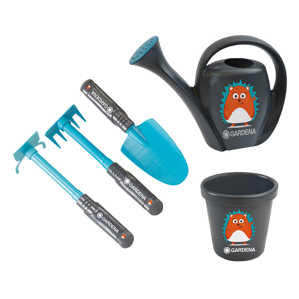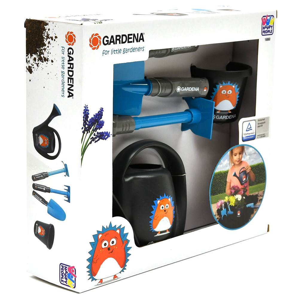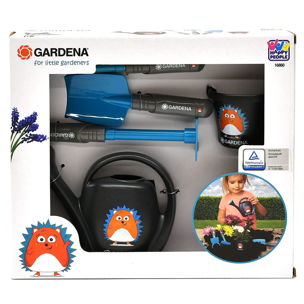 Schop, hark, schoffel ca.17cm, plantpot 6x5cm, gieter 0,3l. Ook voor kinderen jonger dan 3 jaar. Verpakking recyclecode 20 Papier. CE gekeurd. TUV gecertificeerd ID 1419074886