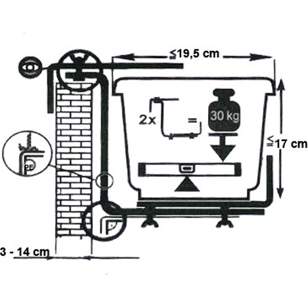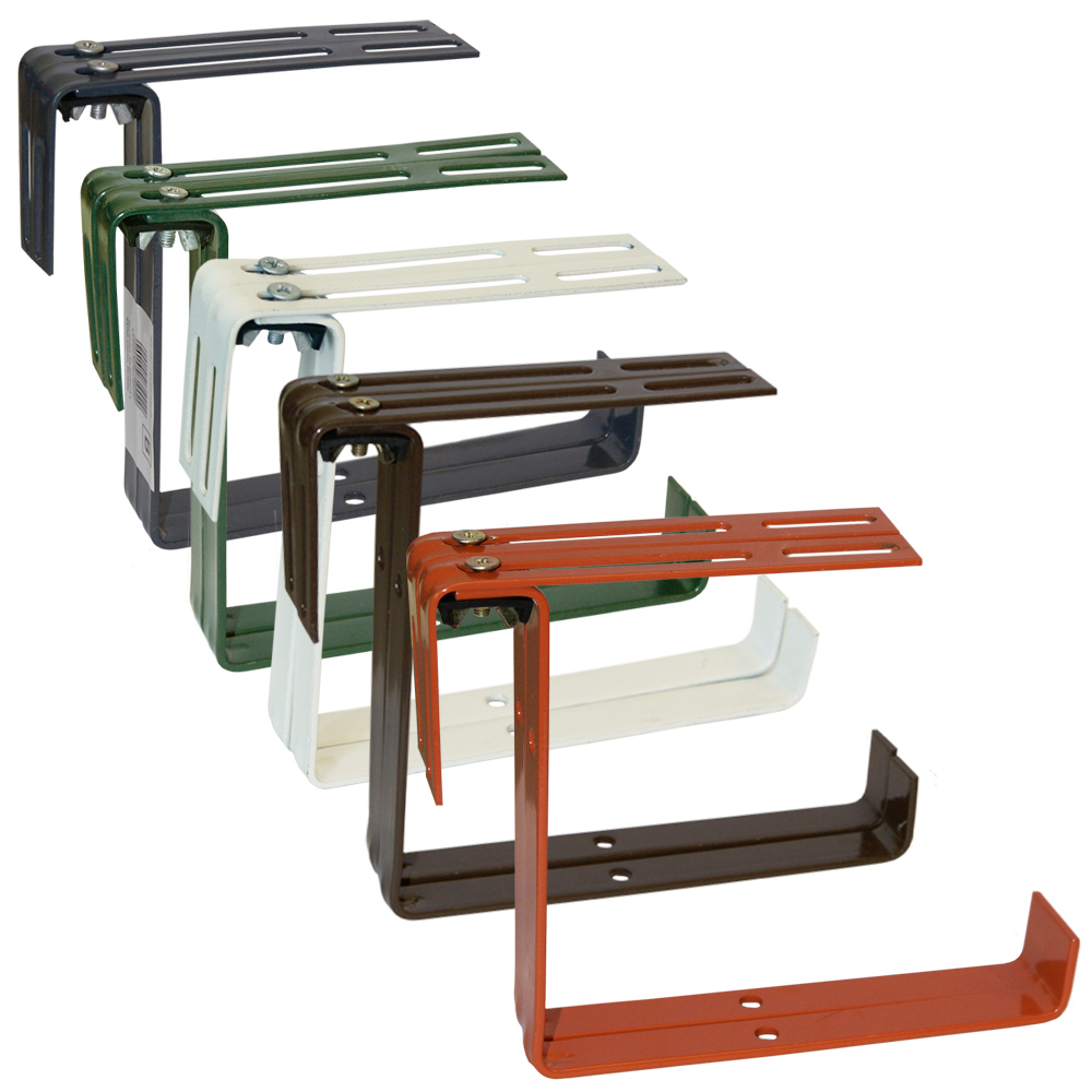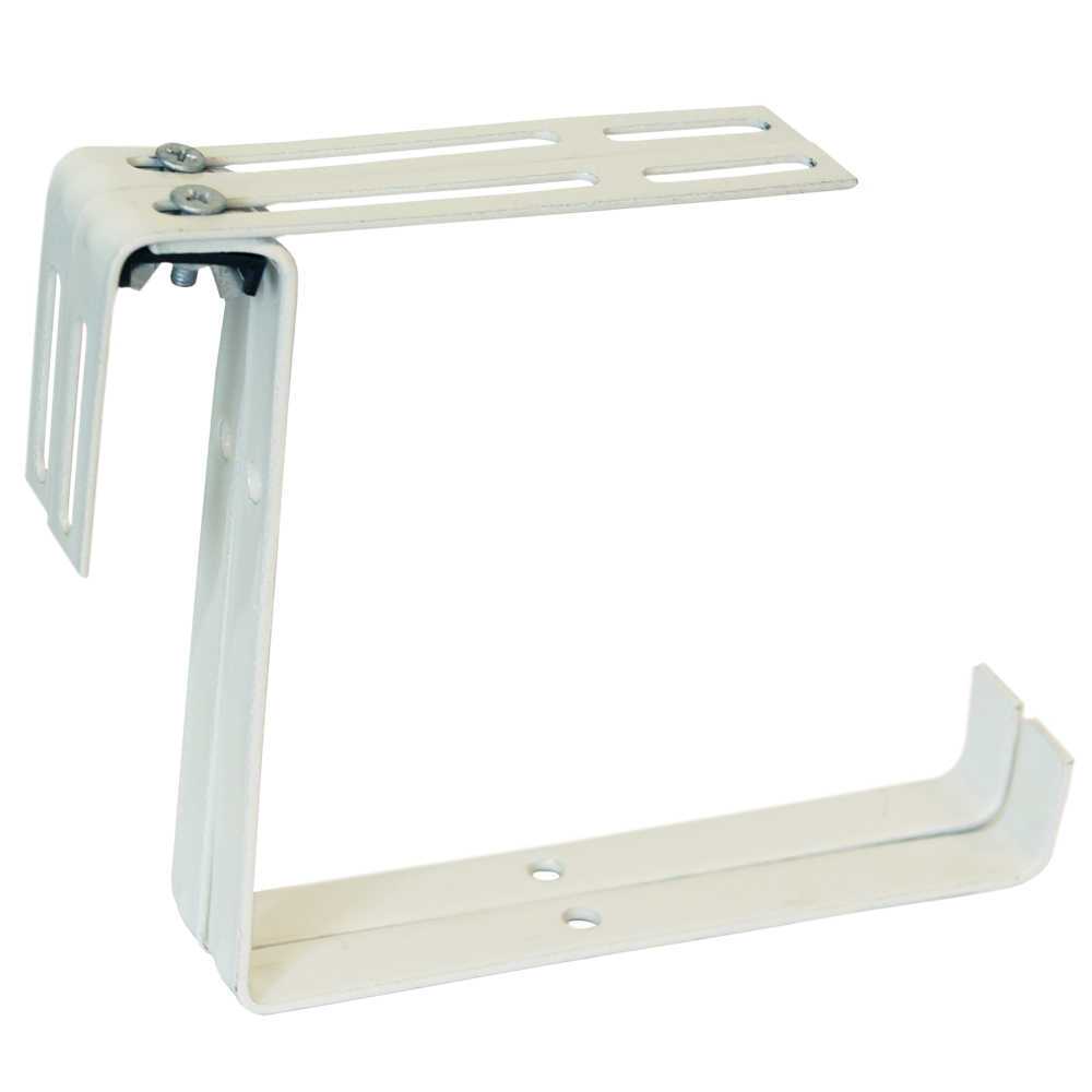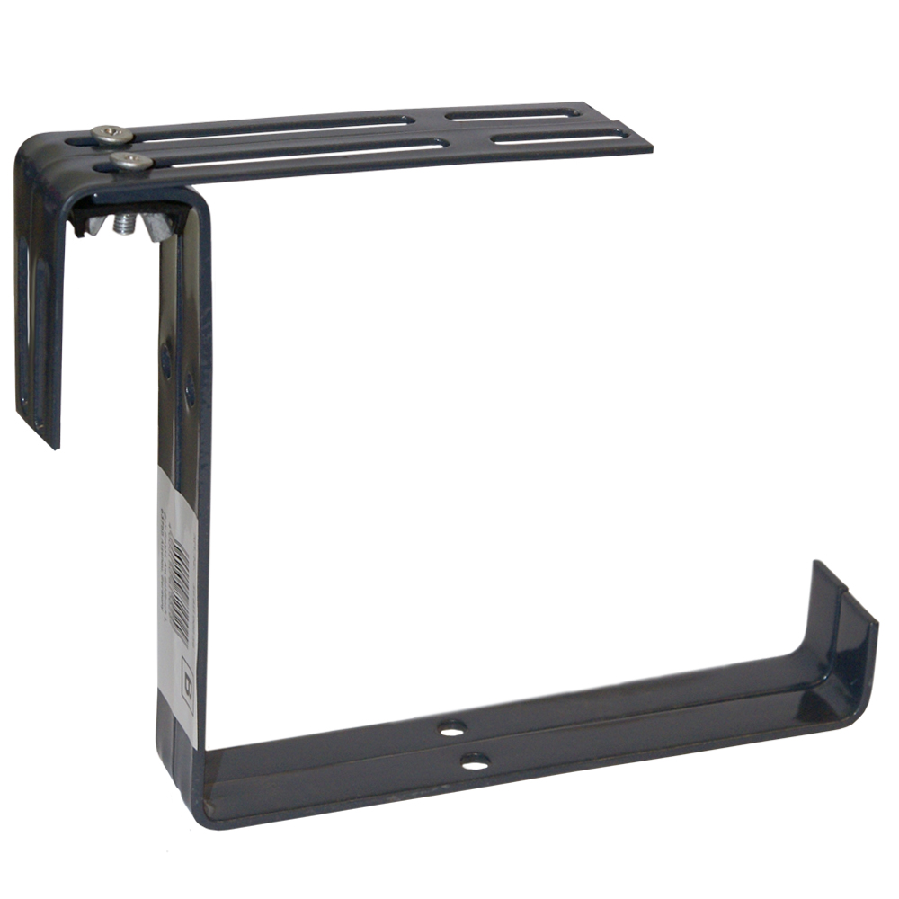 Beugel met vaste grootte ondersteun en aanpasbare bovensteun..Maximale bak diepte 19,5 cm.Maximale balkonbak hoogte 17 cm. Railing/muurmaat van 3-14 cm. Maximaal 30 kilo in de balkonbak..