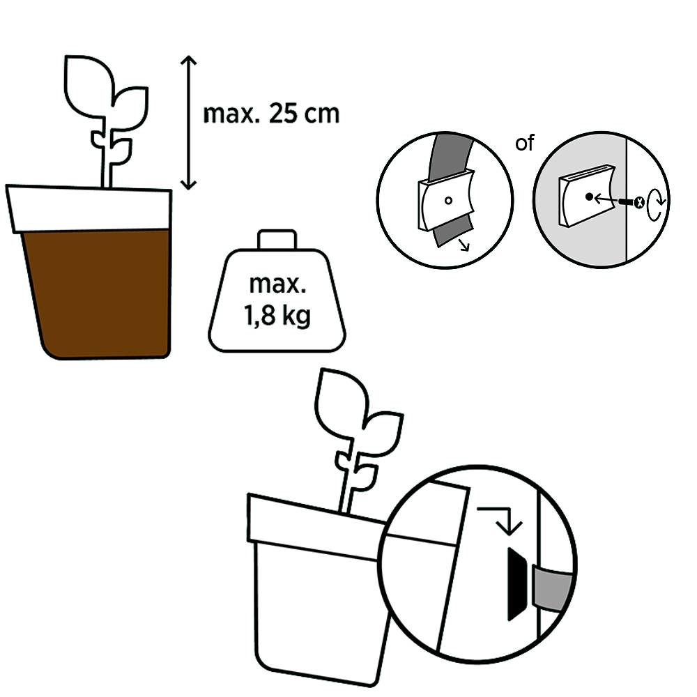 Conny bloempotten zijn speciaal gemaakt om op te hangen aan balkonrailing,regenpijp of aan de muur. Inhoud ca. 1,6 liter. Maximaal draaggewicht 1,8 kilo en maximale planthoogte 25 cm.