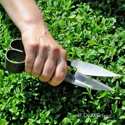 Kleine uitvoering van het topmodel uit 1730 Hand gesmeed. Knipt zeer licht. Geschikt voor licht snoeiwerk, zoals het scheren van buxus, taxus, liguster en ander licht snoeiwerk zoals graskanten en vormsnoei. Deze schaar wordt al net zo lang gebruikt voor het scheren van schapen als voor het knippen van graskanten en het in vorm knippen van buxus. Het staal behoort tot het hardste onder de gereedschappen en staat garant voor een leven lang knipplezier.Gebruik de hele hand bij het knippen, zodat niet twee of drie vingers worden (over)belast. De dubbele boog in de veer maakt dat deze schaar zeer licht knipt en de pols nauwelijks wordt belast. Voor precies knipwerk zoals vormsnoei van buxus ("topiary"). Blad lengte: 9 cm. Blad breedte: 2,8 cm. Totale lengte: 22,5 cm. Materiaal: Koolstofstaal.