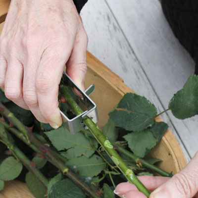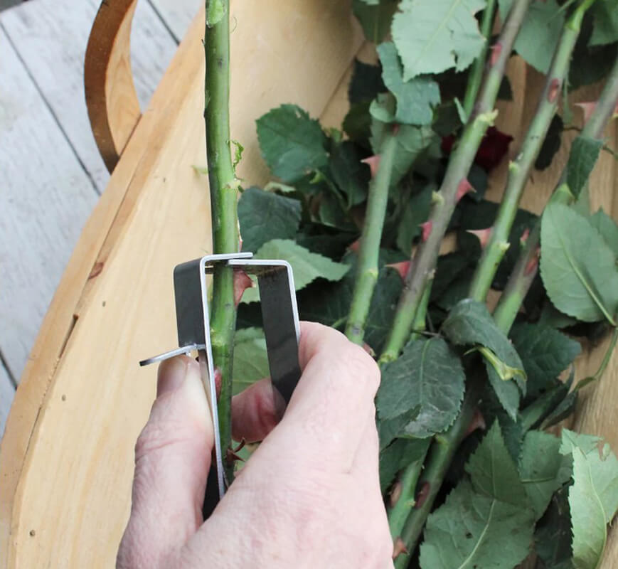 Simpel en doeltreffend hulpmiddel bij het ontdoornen en ontbladeren van de stelen van rozen. Deze ritser is voorzien van een veer. De geslepen binnenrand helpt doornen schoon en snel te verwijderen.