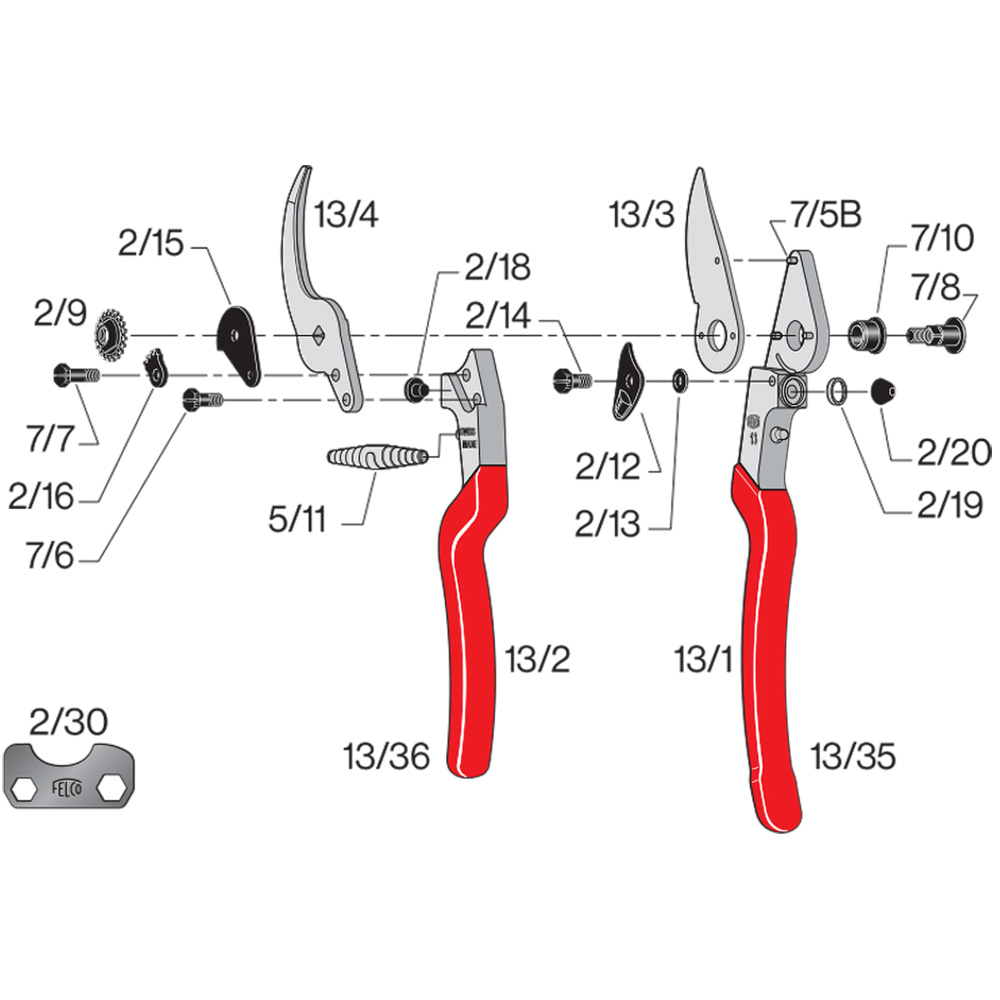 Topprestatie - Gebruik met 1 of 2 handen - 30mm/1.2inch maximale knipopening Betrouwbaarheid: De Felco 13 heeft comfortabele, lichte en stevige handgrepen van gesmeed aluminium met levenslange garantie. Het bovenmes en het geschroefde ondermes zijn uit hoogwaardig gehard staal vervaardigd en maken een nauwkeurige en duidelijke snede. Alle onderdelen kunnen vervangen worden. Doeltreffendheid: De snede, draadsnijder en de sapgoot zijn gemakkelijk en duurzaam ingesteld. Ergonomie: Bescherming van de hand en pols en optimalisatie van de krachten dankzij de ideale vorm van de handgrepen, de gebogen kop en een stootblok inclusief antislip-bekleding.