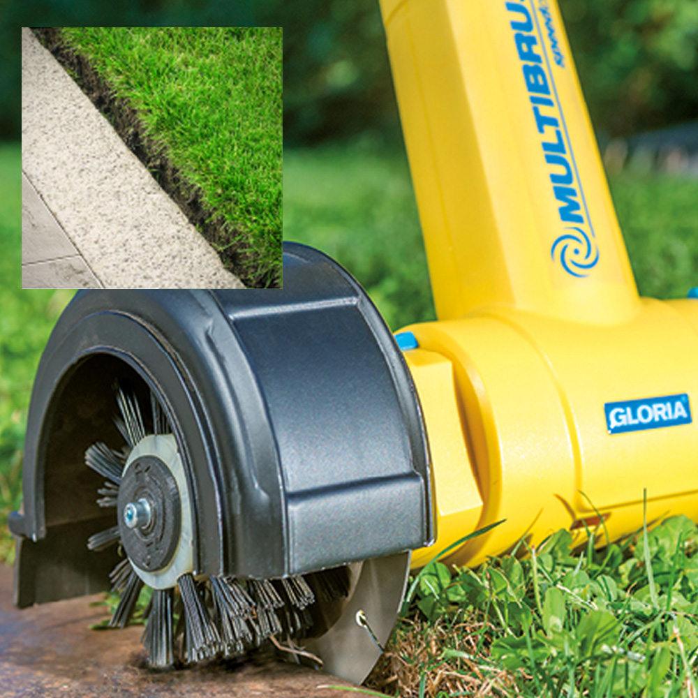 De 2-in-1 kantensnijder Cut&Brush is een eersteklas helper om overwoekerde paden of stoepranden te bevrijden van overhangend gras. De 1 mm dunne, gesleufde roestvrijstalen schijf snijdt in de bodem en gelijktijdig bevrijdt de nylonborstel steenranden van overhangende graswortels.
