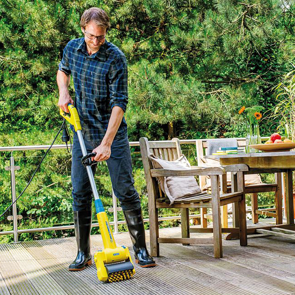 De met een krachtige elektromotor (230 V, 500 W) aangedreven MultiBrush speedcontrol kan worden gebruikt voor de behandeling van stenen- en houten oppervlakken alsmede voor voegenreiniging, voor kantsnijden en voor gazonverzorging. Het vervangen van de afzonderlijke opzetstukken lukt zonder gereedschap.Een traploze toerentalregeling in het greepbereik zorgt voor extra flexibiliteit in het gebruik. Zo kan vuil krachtig van houten oppervlakken worden verwijderd en kunnen verzorgende oliën voorzichtig met hetzelfde apparaat worden ingewerkt.