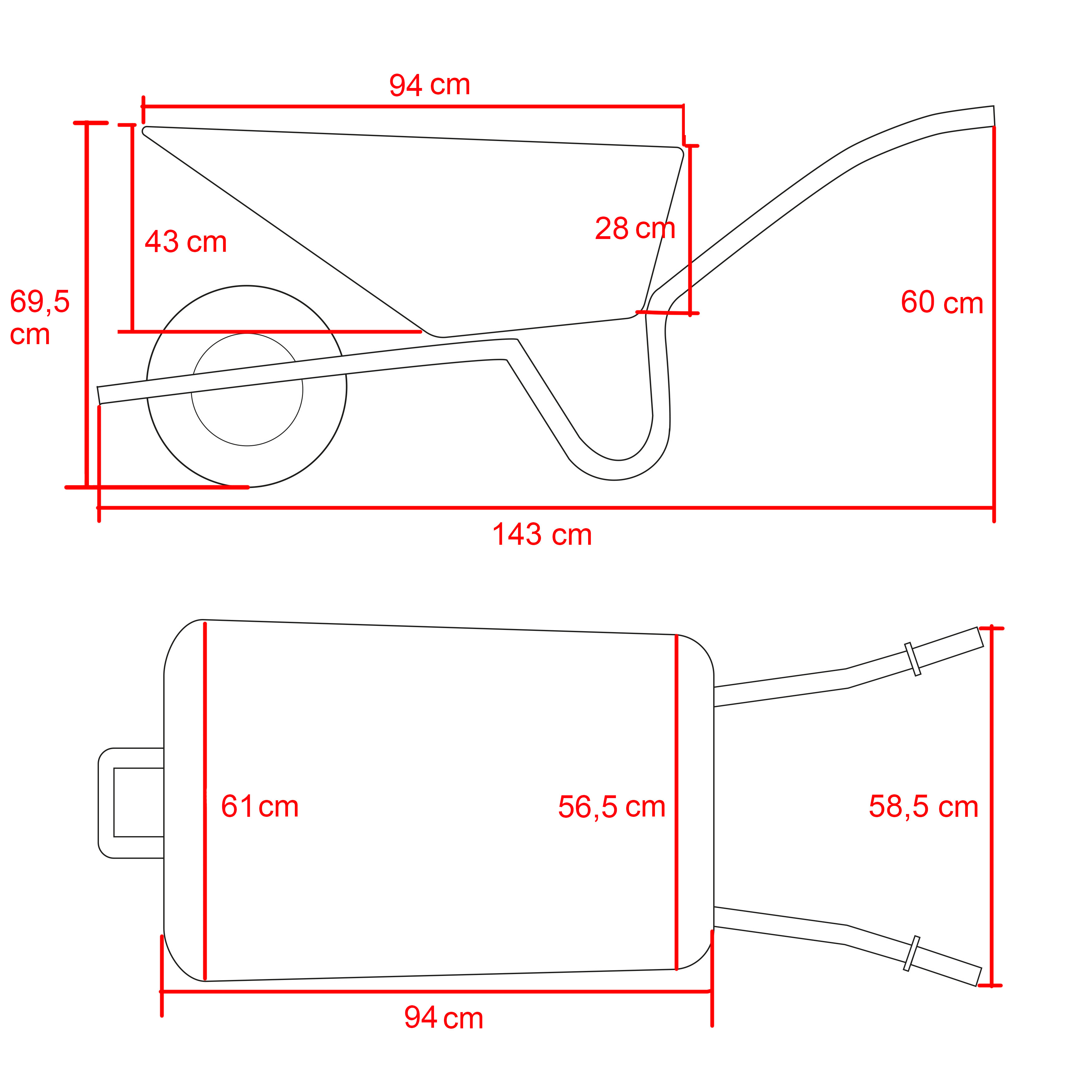 Kunststof PP bak 100 liter. Frame van premium grijs gecoate ronde buis in RAL 7016 en voorzien van slijtsloffen. Wiel 400x8 4ply met kunststof velg, kogellagers en binnenband. Draagvermogen 150 kilo.