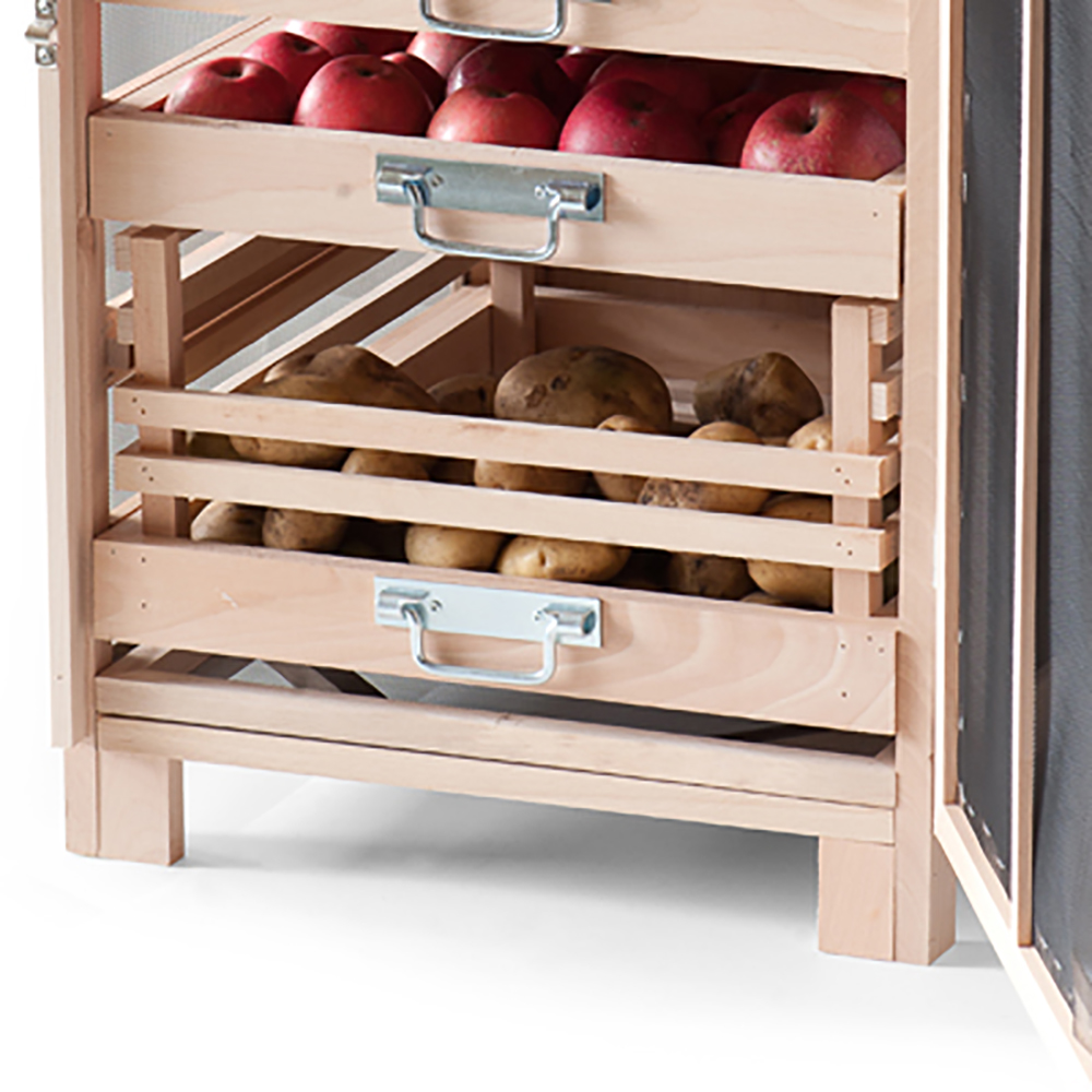 Deze past in de proviandkast en neemt de ruimte in van 2 gewone laden. Speciaal geschikt om de aardappels of bloembollen droog te kunnen bewaren.