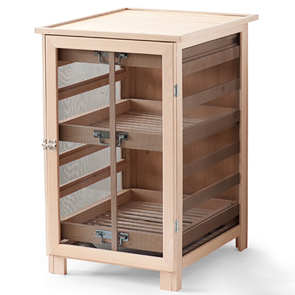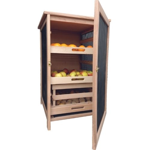 De beukenhouten proviandkast is voorzien van metalen hang- en sluitwerk en zwart horrengaas. Gemaakt om diverse soorten oogst op een ongedierte-vrije plek buiten de koelkast te bewaren. Door het tijdloze ontwerp van de proviandkast is het een aanwinst voor iedere bijkeuken, schuur, veranda of balkon. De proviandkast is gemaakt met franse slag, dus het hang en sluitwerk is soms niet heel precies! maar het is zo'n uniek product! De meegeleverde schuiflades zijn opgebouwd uit 2 cm brede spijlen met 2 cm brede tussenruimten, waardoor de oogst gelijkmatig kan rijpen. Standaard inclusief 3 en uitbreidbaar tot maximaal 6 laden