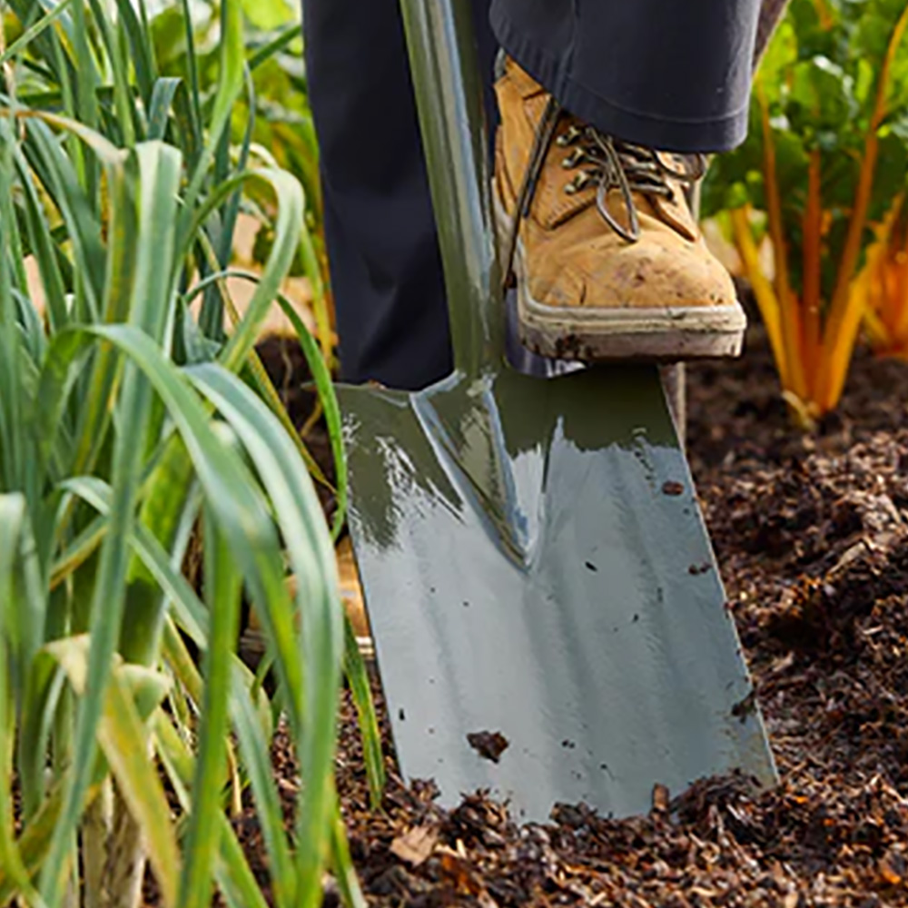 Een sterke poedercoating in een opvallend groen beschermt tegen roest. Brede, comfortabele treden aan de bovenkant van het blad voorkomen ongemak voor de voeten. Een scherpe rand snijdt gemakkelijk door lastige grond.