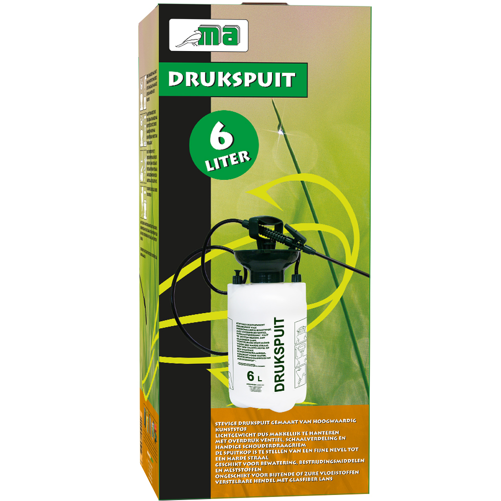 Draagbare drukspuit met een inhoud van 6 liter. Zeer geschikt voor de grote klussen in de tuin. De spuitknop is vast te zetten om het continue spuiten te vergemakkelijken. Met messing sproeimond om de straal aan te passen van een harde straal naar een zachte nevel. Niet geschikt voor zure of bijtende vloeistoffen.