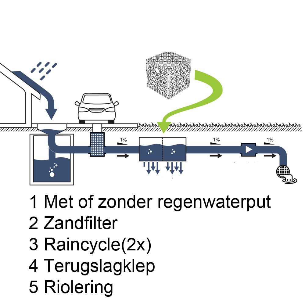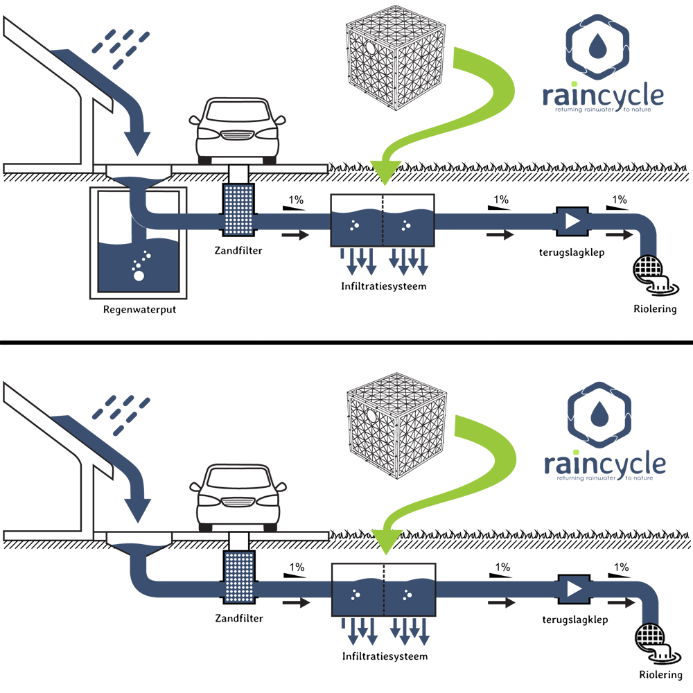 Raincycle is een drainage en infiltratiesysteem die een rustige en geleidelijke opname van regenwater van de grond bevorderd. Hierdoor wordt het wegstromen van hemelwater naar het riool voorkomen en kan het hemelwater weer opgenomen worden in zijn natuurlijke cyclus. Elke Raincycle krat is een modulair zelfbouwsysteem en bestaat uit 7 losse panelen., dit om de verpakking zo klein mogelijk te houden met het oog op ecologische voetafdruk. De Raincycle is gemaakt van gerecycled kunststof. Eén krat is geschikt voor ca.7 m2 dak-of terrasoppervlakte. Voor meer informatie en/of aansluitinstructies; zie de attachements onderaan de webpagina.