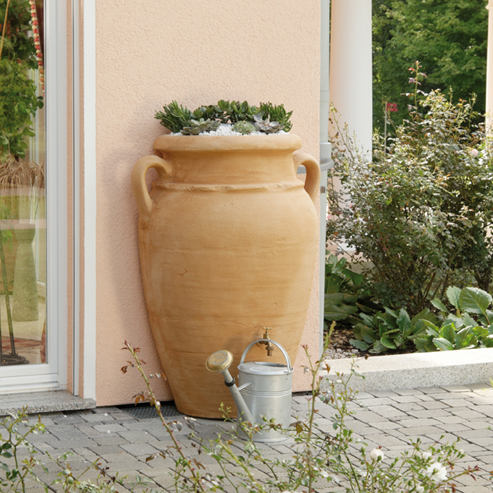 Regenton Antique amphora ton inclusief kraan en geintegreerde plantenbak. - Zeer realistische weergave van een terracotta vaas - De structuur is op elke tank anders waardoor elke tank uniek is - Met geintegreerde plantenbak - Grote opslag met minimaal ruimtegebruik - Winter/vorstbestendig mits leeg en met kraan open - UV stabiel en weersbestendig. Aan de muur te bevestigen